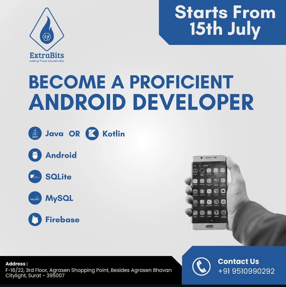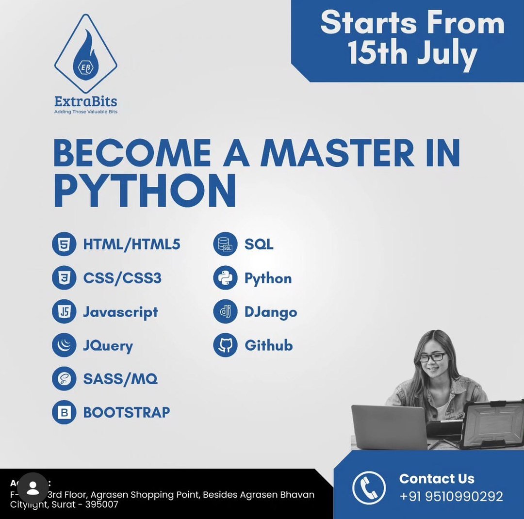 ExtraBits Academy is Surat’s top-rated IT training institute, trusted by students from Adajan, Vesu, Althan, Varachha, Katargam, Pal, Piplod, Udhna, Bhestan, Limbayat, Citylight, Ghod Dod Road, Nanpura, Sarthana, Hazira, Salabatpura, Gopipura, Chowk Bazaar, Rustampura, and more. We offer expert-led, project-based training in Python, Java, C/C++, DSA with C, Full Stack (Django, PHP, MERN, MEAN), UI/UX, Flutter, Android, Digital Marketing, Graphic Designing, Video Editing, Cyber Security, ASP.NET, WordPress, Shopify, React Native, Content Creation, and Filmmaking. Learn with real tools, real mentors, and real results—at ExtraBits Academy.